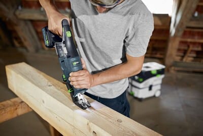 A focused range of high-quality, task-specific blades help you conquer nearly any application. And with a tool-free, quick-release mechanism, saw blade changes are fast and easy helping to avoid direct contact with a hot blade. Work and move efficiently with the machine and blades neatly stored in a Festool Systainer providing a great way to store and transport the saw and all the accessories including the suction adapter for dust-free work and Bluetoothยฎ battery packs for conveniently activating the dust extractor.